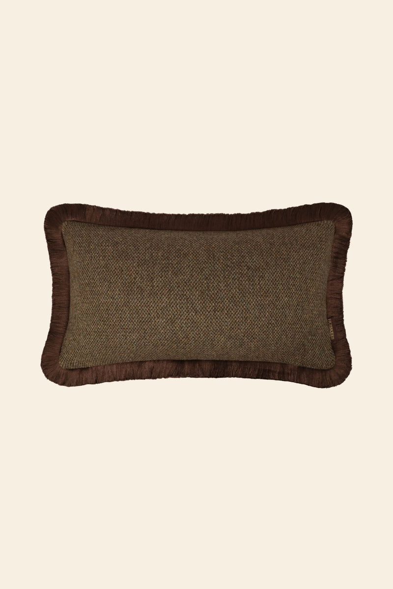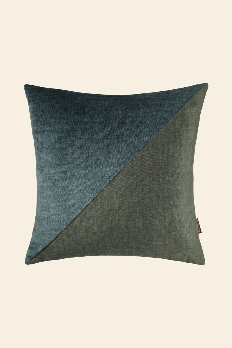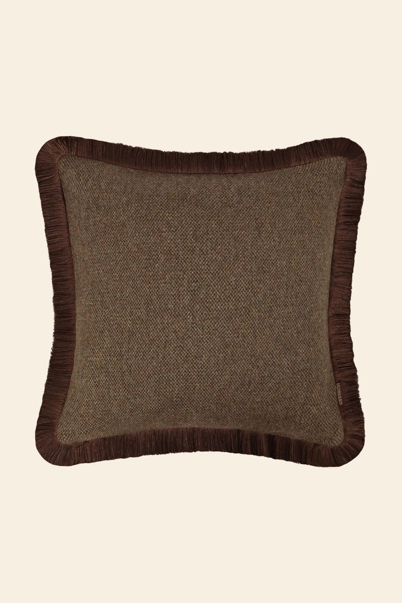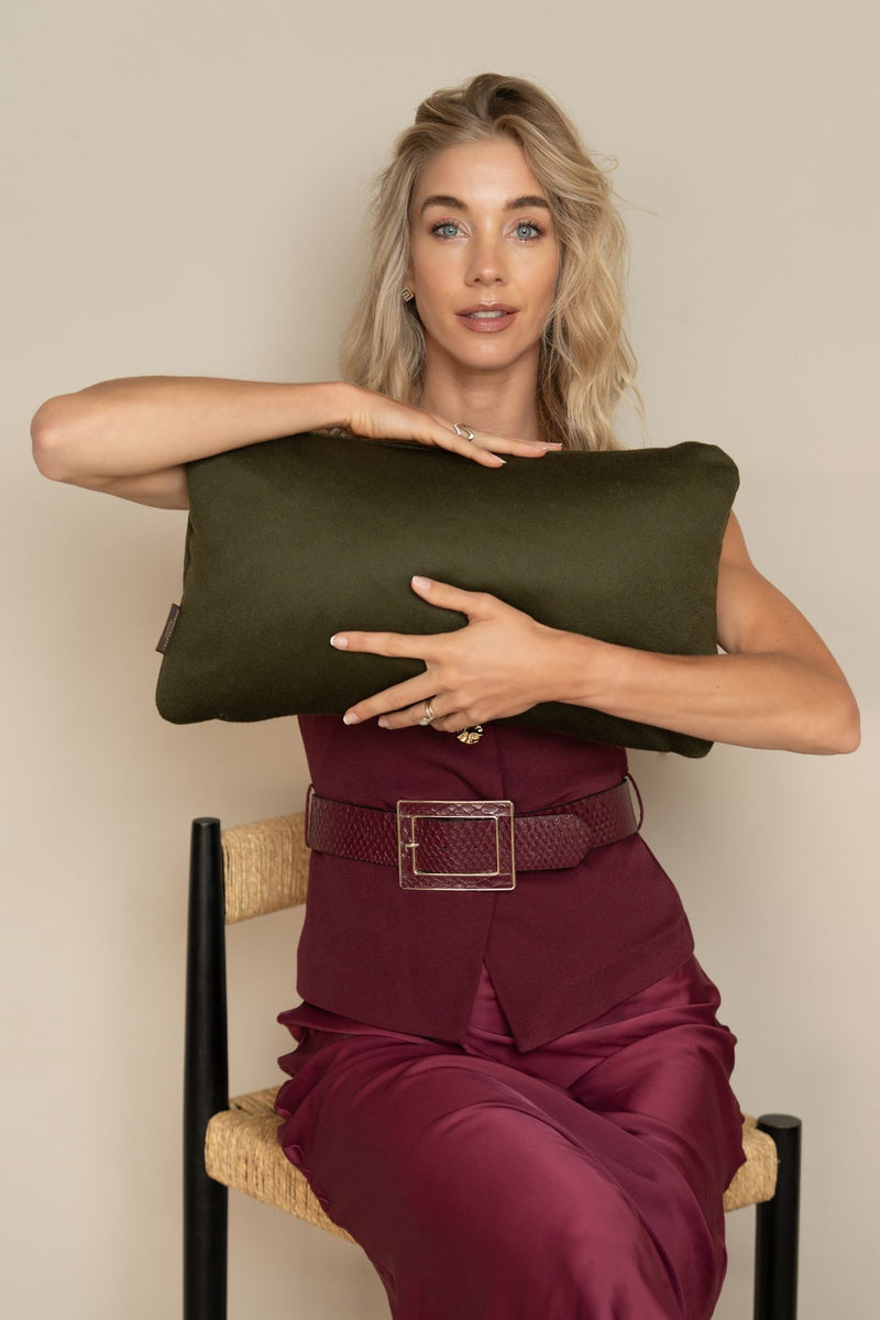 Wat deze kussens echt uniek maakt, is het ongekende textuurcontrast. Een groot deel van de collectie is vervaardigd uit hoogwaardige wol en kasjmier, afkomstig van Italiaanse deadstock stoffen. De combinatie van de matte, zachte uitstraling van wol met de glans van klassieke wevingen creëert een gelaagdheid die je niet alleen ziet, maar ook voelt.