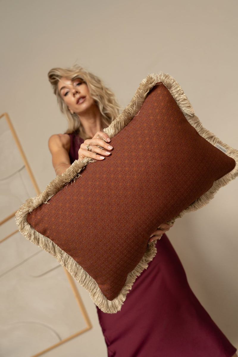 Veel klanten vragen: "Welke kussens passen op een donkergroene of bruine bank?" De Crimson & Clover collectie is het antwoord. Combineer een dieprood kussen van wol met een oranje rechthoekig kussen met franjes. Het contrast tussen de materialen (kasjmier vs. klassieke weving) zorgt ervoor dat de donkere bank tot leven komt zonder te druk te worden.