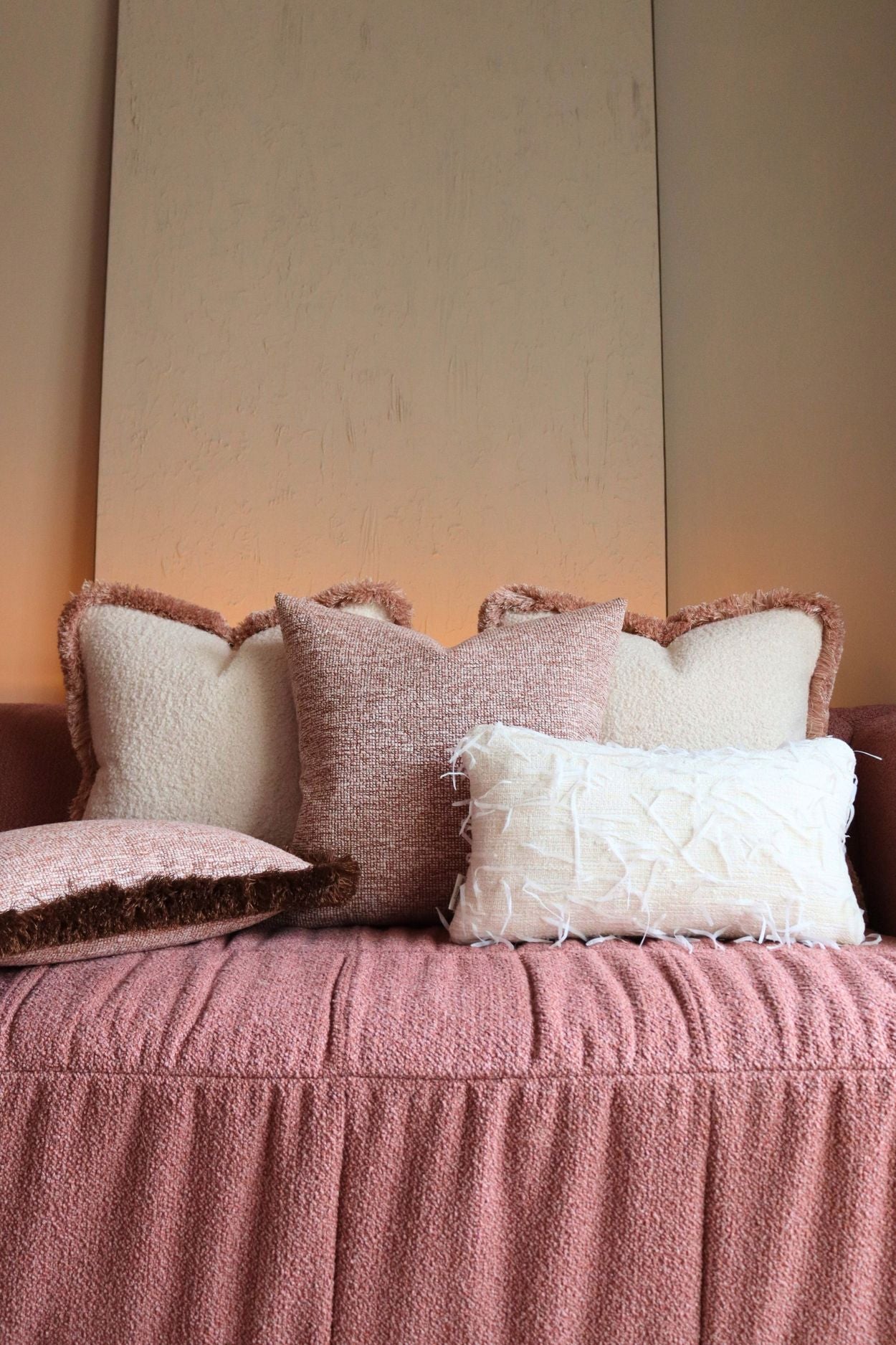 With this pink pillow, you can add more depth to a plain sofa. For an optimal effect, combine this pillow with smooth fabrics such as cashmere or velvet. The contrast between the grainy texture of this fabric and the softness of a smooth fabric creates a rich textural contrast.
